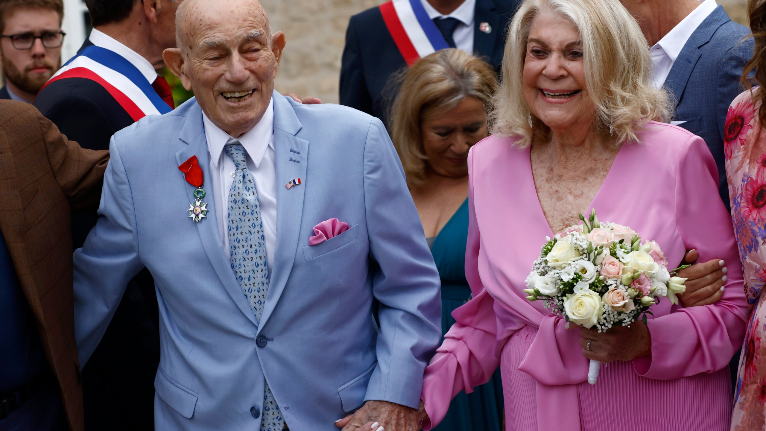 CARENTAN-LES-MARAIS, France (AP) — Together, the collective age of the bride and groom was nearly 200. But World War II veteran Harold Terens and his sweetheart Jeanne Swerlin proved that love is eternal as they tied the knot Saturday inland of the D-Day beaches in Normandy, France.