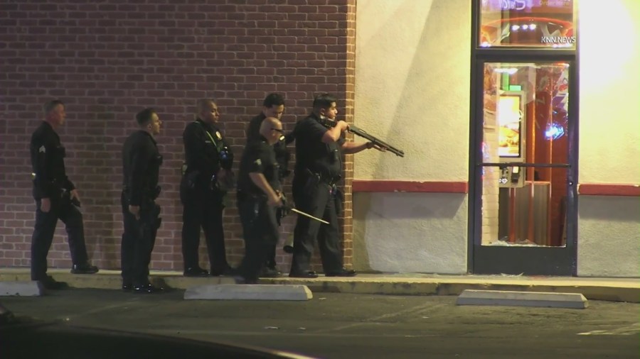 Video from the scene obtained by KTLA shows multiple officers lining up outside the broken door with their weapons drawn before entering the restaurant.