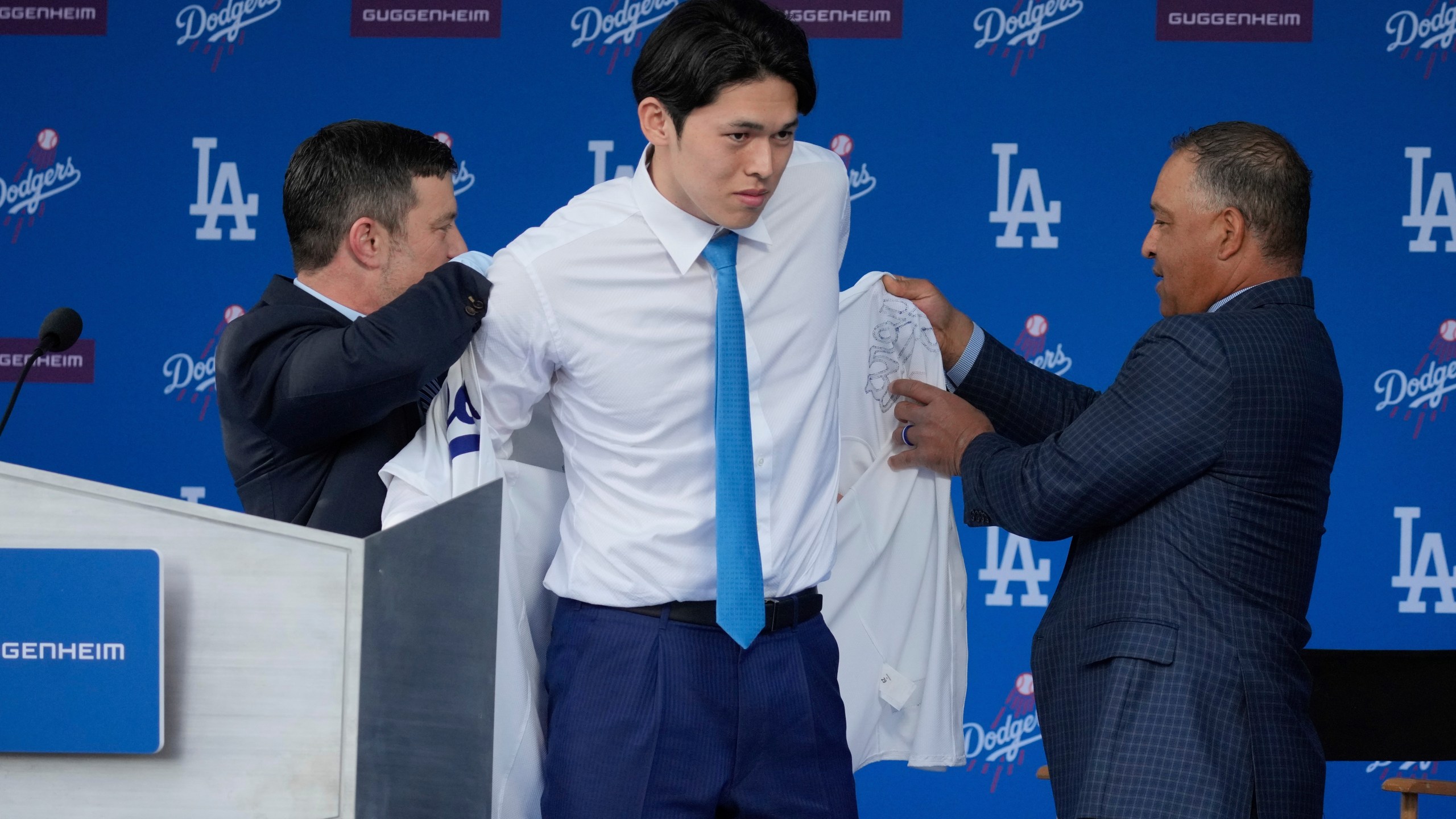 In introducing Sasaki, Friedman called him “one of the most electrifying and promising talents in the game.” He said the Dodgers had been following Sasaki for the last six years, with their scouts first seeing him in high school in Japan.