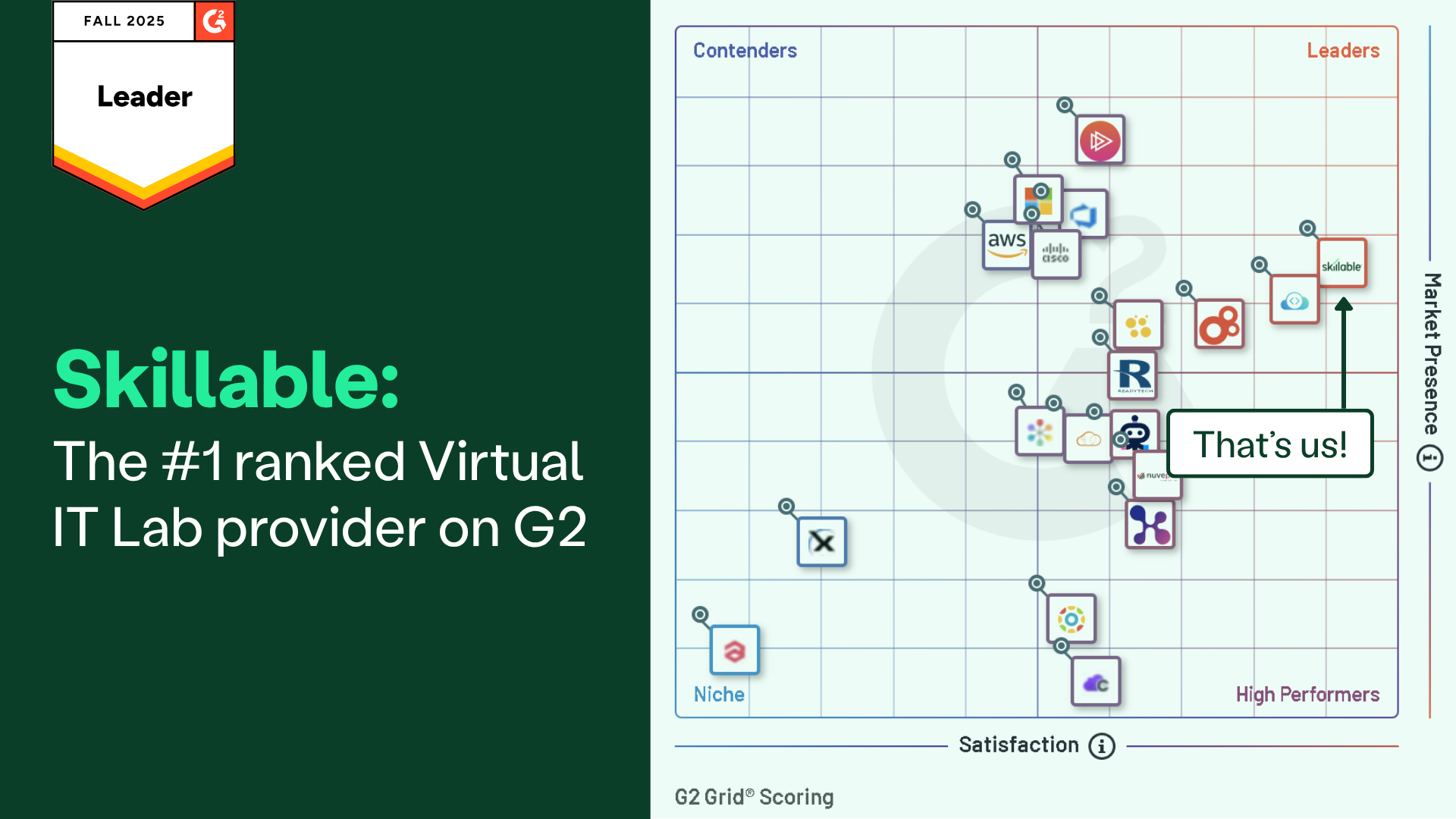 NEW PORT RICHEY, FL, UNITED STATES, October 9, 2025 /EINPresswire.com/ -- Skillable, the pioneer in performance-based learning and skill validation, has been recognized for its market-leading virtual IT labs for the 17th consecutive time by G2, the leading peer-to-peer software review platform. Skillable has consistently led in the virtual IT labs market on G2 with users mentioning how intuitive and impactful the hands-on training platform is, what a game-changer is it for technical skill development and its continuous innovation. Alongside the category leadership, Skillable was recognized as number one in User Satisfaction, Adaptive Learning, Results and Implementation.