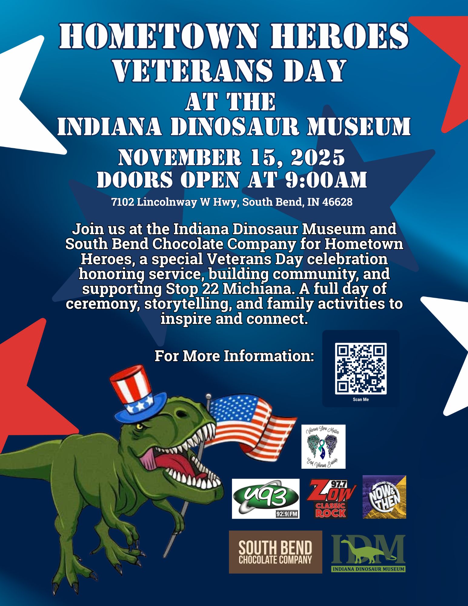 SOUTH BEND, IN, UNITED STATES, October 23, 2025 /EINPresswire.com/ -- On Saturday, November 15, the Indiana Dinosaur Museum and South Bend Chocolate Company will host Hometown Heroes: A full day celebration honoring service, building community, and supporting Stop 22 Michiana, a nonprofit dedicated to preventing veteran suicide and strengthening local support.