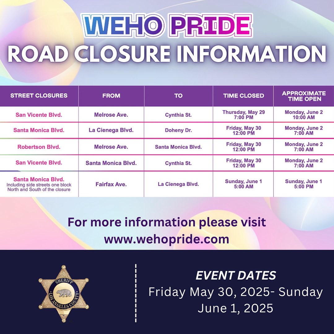 Starting on Friday at noon, Santa Monica Boulevard will be closed from La Cienega Boulevard to Doheny Drive. Robertson Boulevard will be closed from Melrose Avenue and Santa Monica Boulevard. San Vicente Boulevard will be closed between Santa Monica Boulevard and Cynthia Street. These closures will reopen at 7:00 a.m. on June 2.