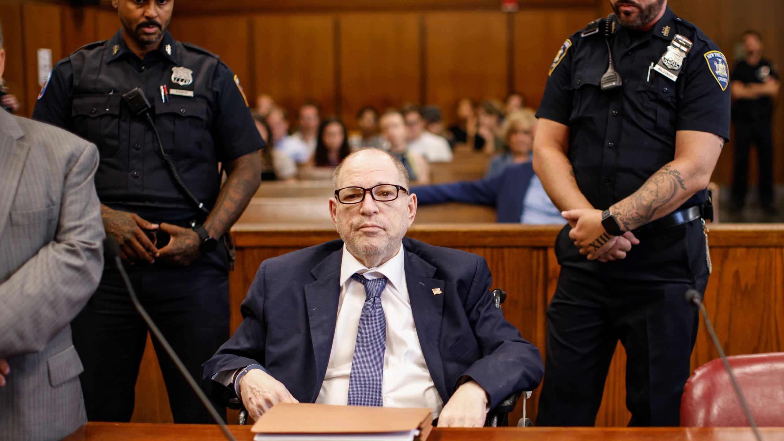 Weinstein wore an American flag pin on his jacket during a brief court appearance in Manhattan that was delayed by more than 90 minutes due to a disruption that affected computers around the world, according to Judge Curtis Farber.