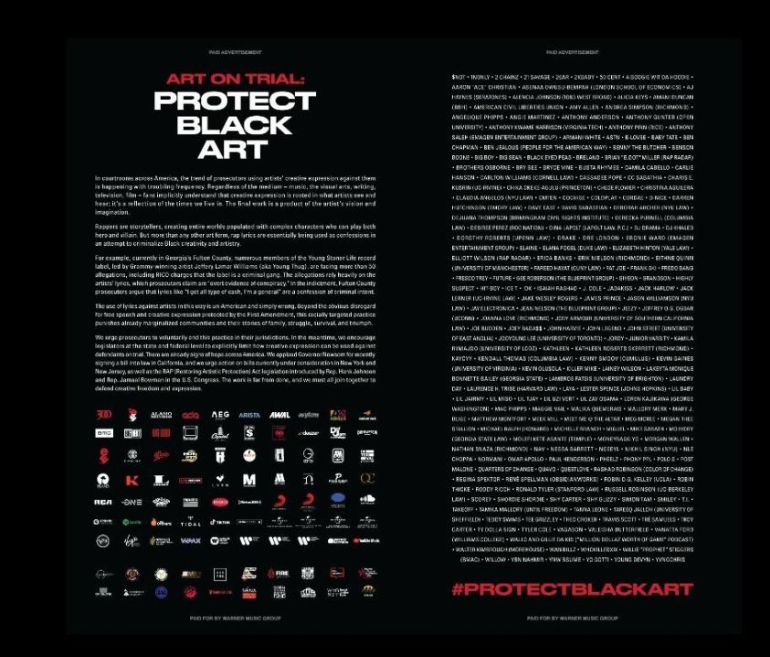 “Throughout history, artists have created characters and forged narratives that reflect the culture around them. That freedom of expression is essential to the creative process and the role of art in society,” explained Julie Greenwald, Chairman & CEO of WMG’s Atlantic Music Group. “The harsh reality is that Black artistic creativity is being threatened at an unprecedented level, and we must make every effort to stop this unethical, discriminatory approach to prosecution.”