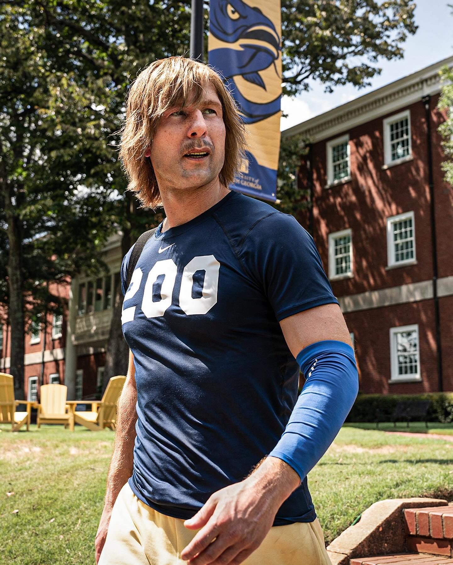 The “Twisters” star, 35, was wearing a wig and a football uniform in character as Chad Powers when he made a surprise appearance at Sanford Stadium on Saturday.