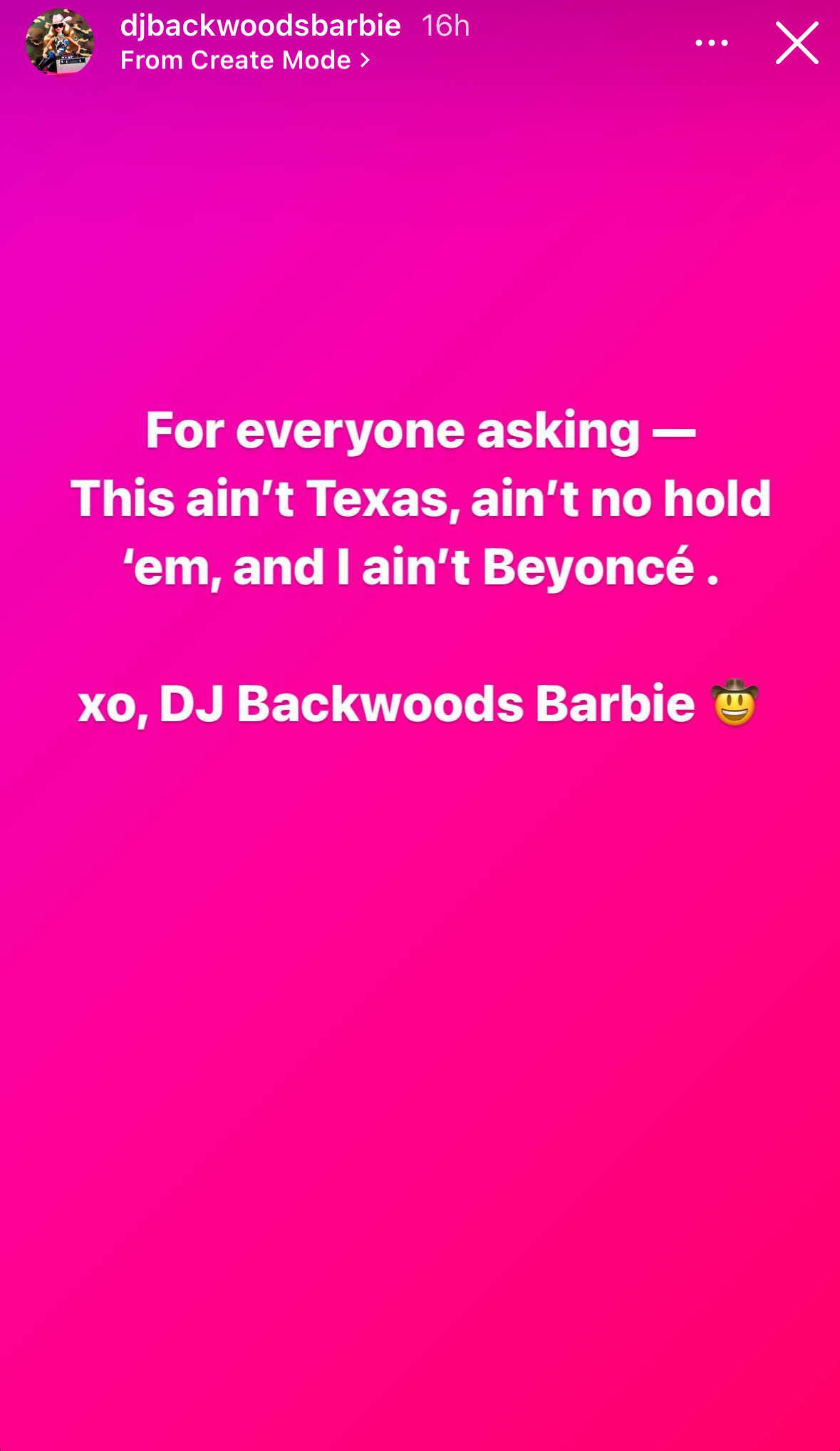 “For everyone asking- This ain’t Texas, ain’t no hold ’em, and I ain’t Beyoncé. xo DJ Backwoods Barbie.”