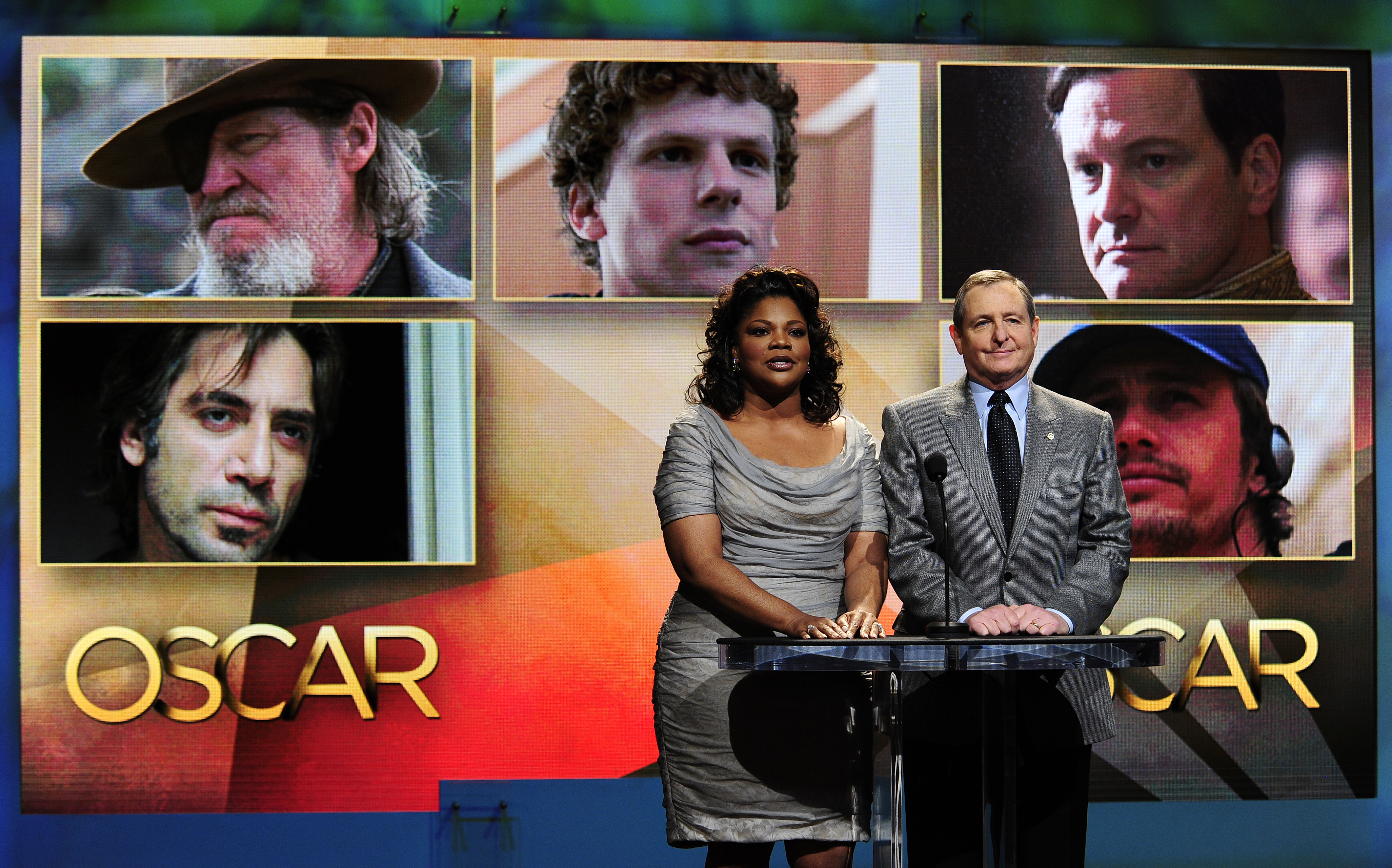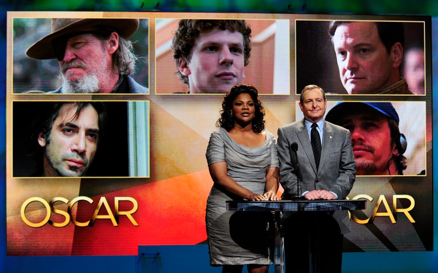 Actress Mo’Nique and Academy of Motion Picture Arts and Sciences Pres. Tom Sherak read the nominees for Best Actor at the 83rd Annual Academy Awards Nominations Announcement Jan. 25, 2011, in California. Nominees included Jesse Eisenberg in “The Social Network.” (Robyn Beck/AFP via Getty Images)