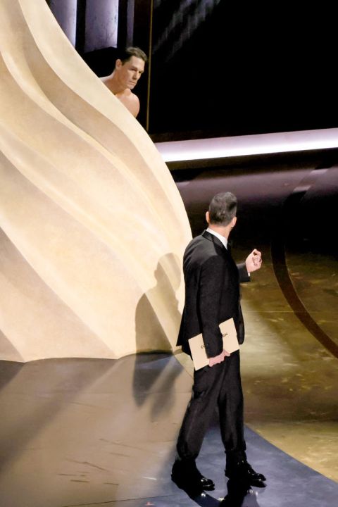 Kimmel worked in a bit about a nude man running across the stage, when Cena appeared behind one of the props.