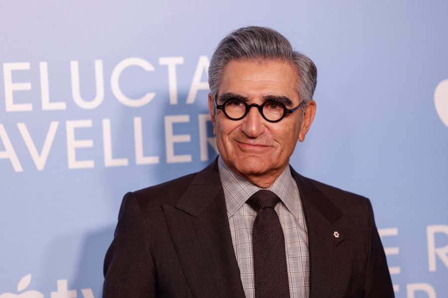 Eugene Levy poses for photographers upon arrival for the premiere of the film ‘The Reluctant Traveller’ in London, Feb. 14, 2023. (Photo by Vianney Le Caer/Invision/AP)