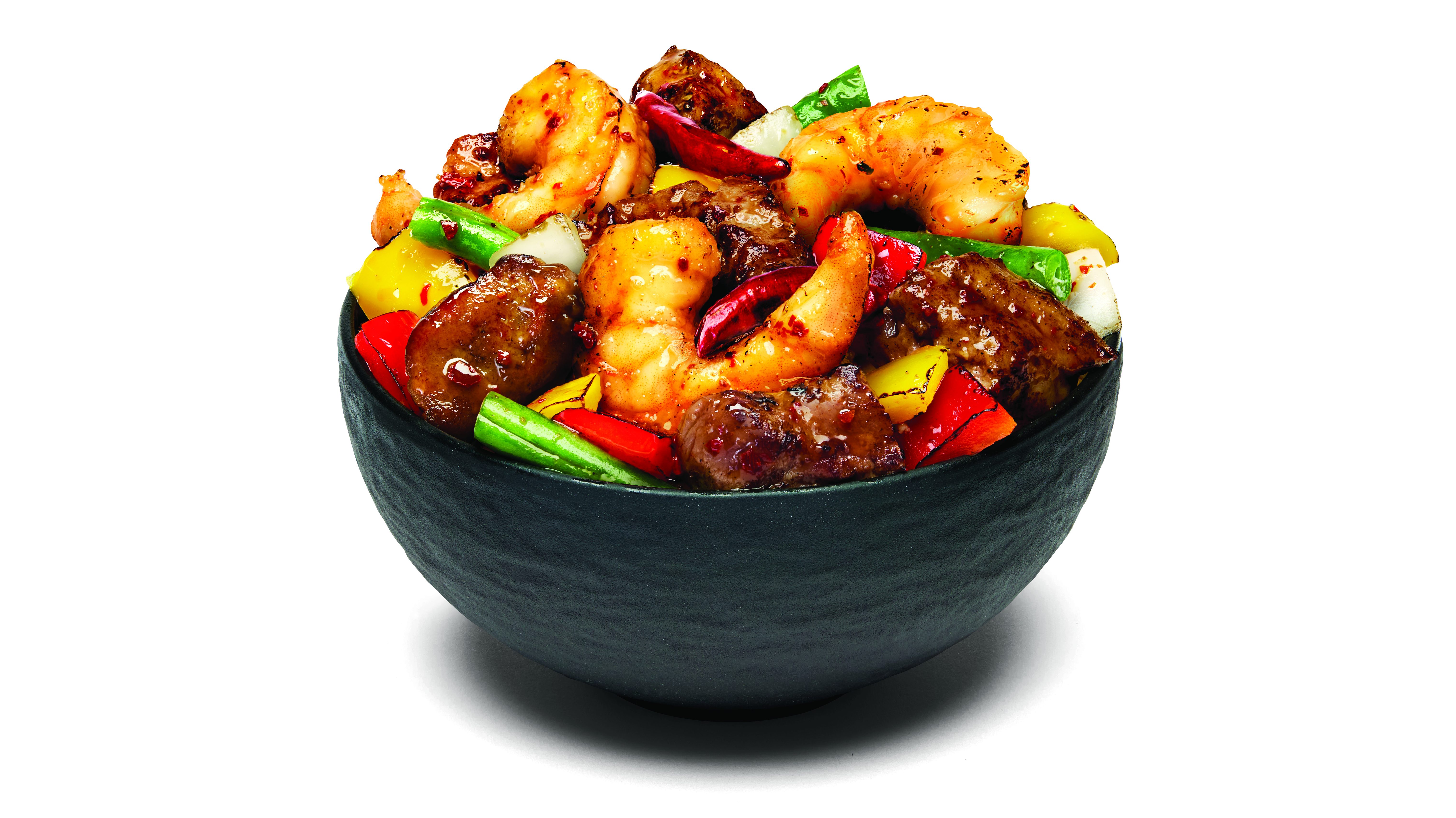The dish features sirloin steak bites and shrimp that are cooked and tossed in a wok alongside red and yellow bell peppers, onions, string beans and dried chili peppers.