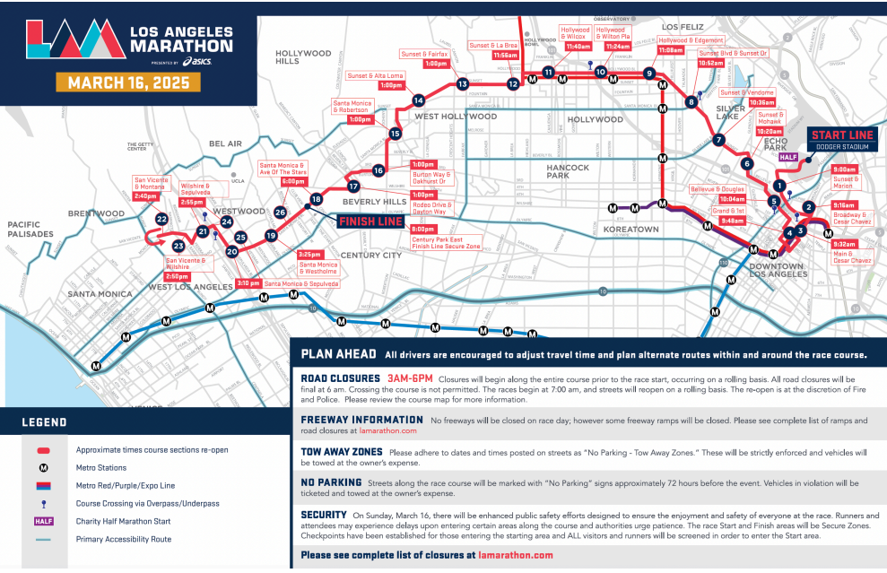 The Los Angeles Marathon is a 26.2-mile tour of the best of Los Angeles. The race starts at Dodger Stadium, winds through some of the city’s most iconic neighborhoods, including Chinatown, downtown Los Angeles, Echo Park, Hollywood, West Hollywood, Beverly Hills, Brentwood, and finish in Century City. You’ll also pass by historic and cultural landmarks such as the Chinatown Dragon Gate, Olvera Street, Los Angeles City Hall, Little Tokyo, Cathedral of our Lady of Angels, Capitol Records Tower, Hollywood Walk of Fame, Grauman’s Chinese Theater, The Troubadour, Rodeo Drive, and Route 66.