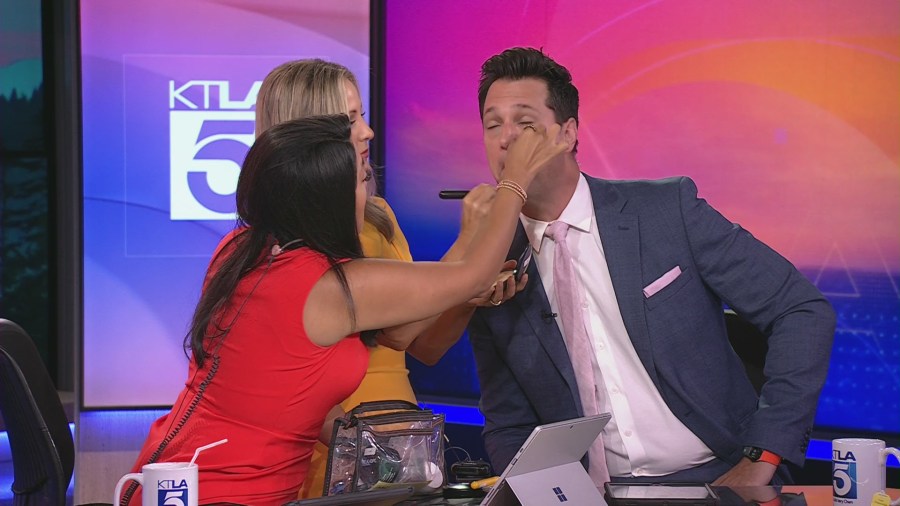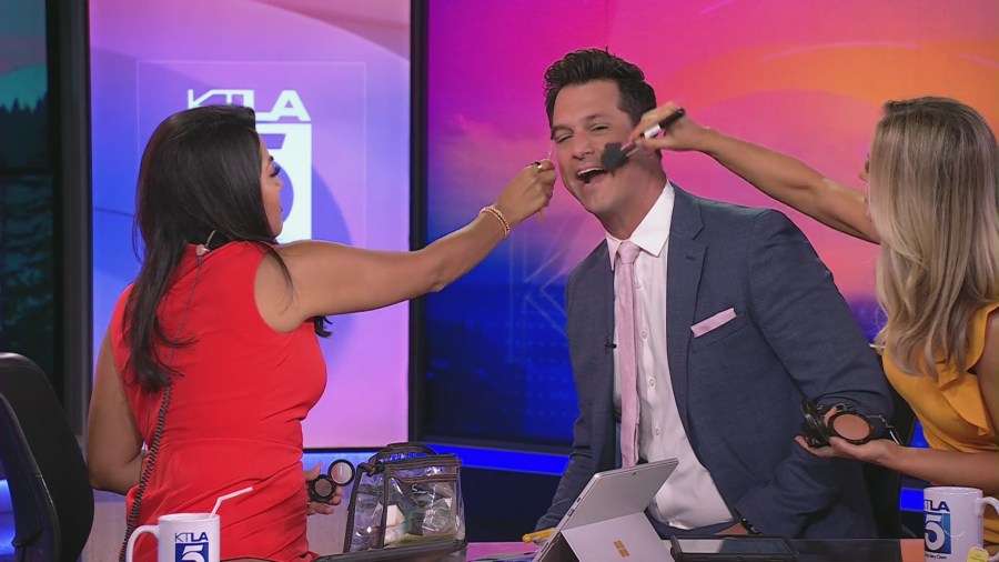 KTLA typically has a makeup artist for the anchors on set for the Weekend Morning News; however, on Sunday, she was sick. Thus, entertainment reporter Doug Kolk needed some help.