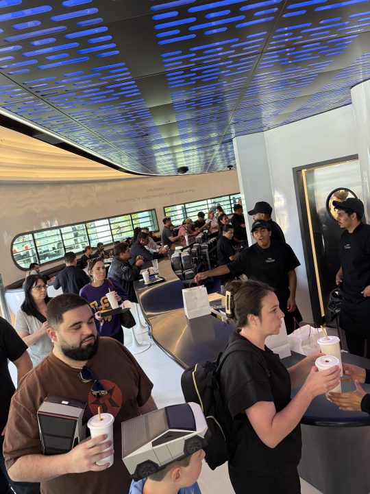 Walking upstairs is an experience in itself – it feels like you’re entering outer space. They call it the Skypad. It has a 360-degree wraparound view, tables and a bar that serves up more merchandise. On opening day, they had a robot handing out popcorn, but I’m not sure if that’s actually a recurring feature, although guests I spoke with were hoping it was.