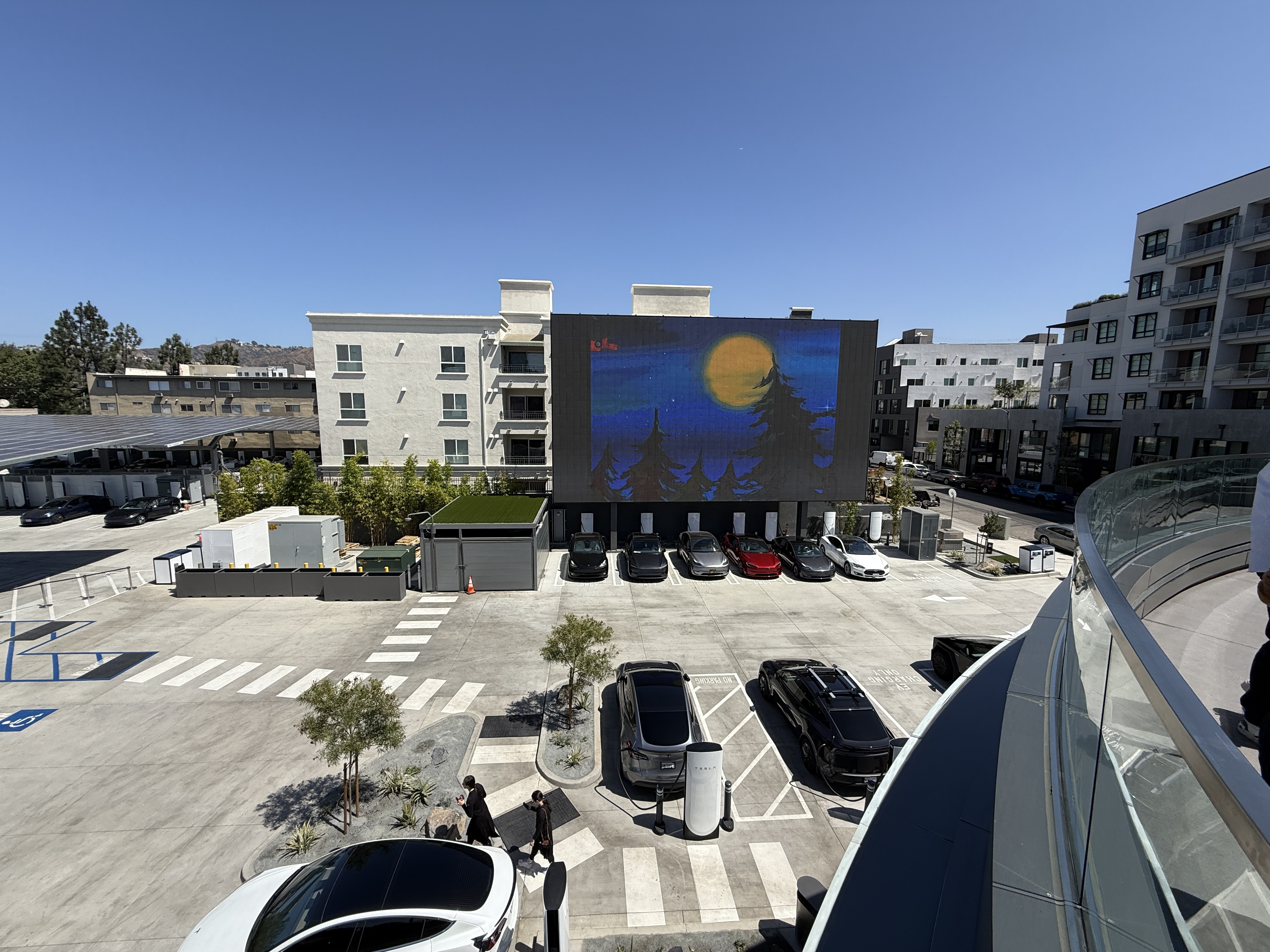 A Tesla isn’t required for entry, but an EV will get you a spot in the parking lot at one of 80 Superchargers – the largest urban station in the U.S.