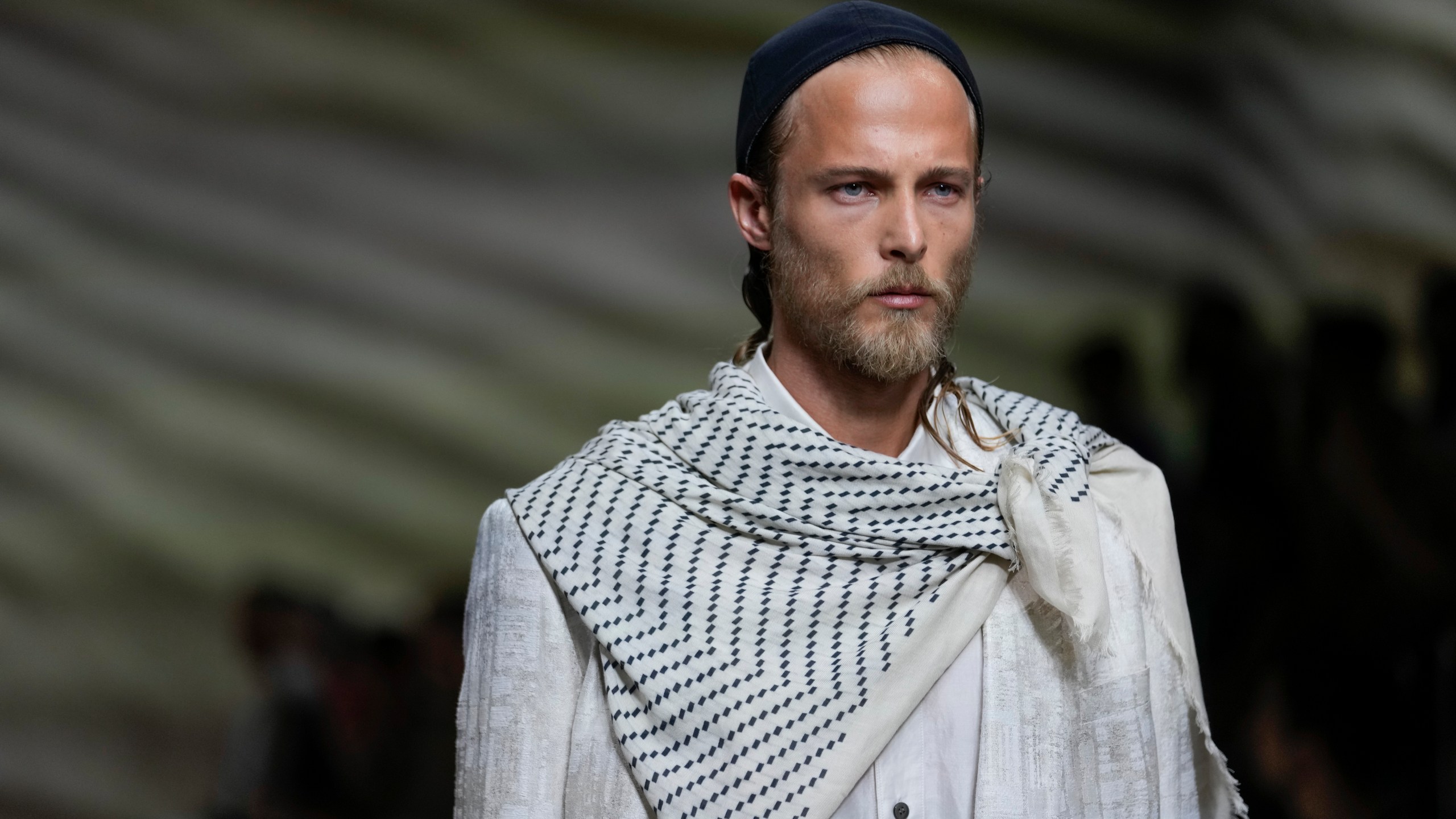 On that front, Armani created tunic-length tops. Jackets and shirts have a sheen rarely seen in menswear. A well-tied foulard substitutes a shirt under an open jacket. A scarf creates a sweeping effect on top of a white suit.
