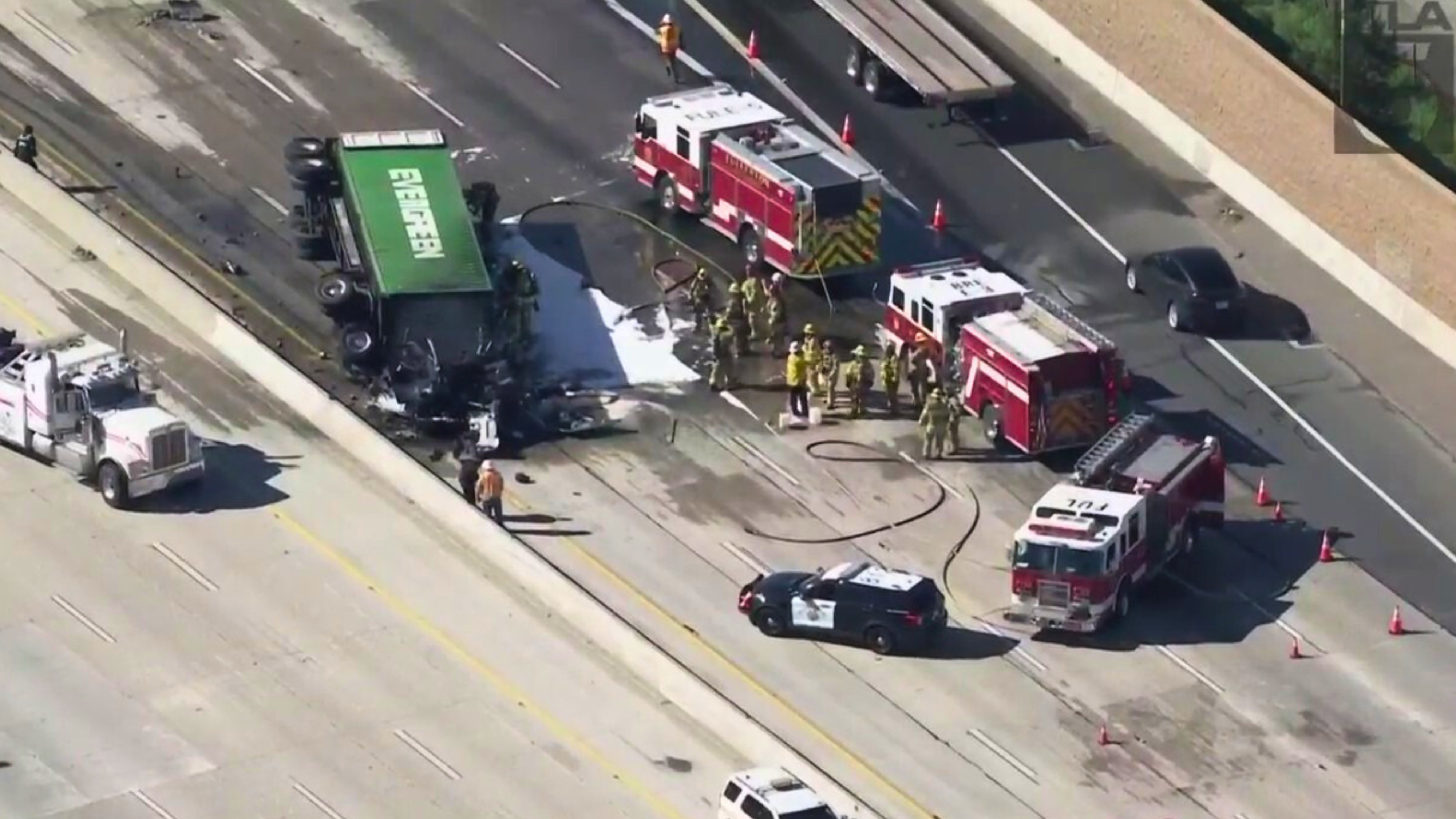 A big rig crashed through a center divider on the 57 Freeway in Orange County on March 25, 2024.