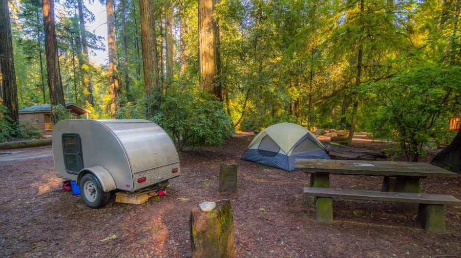A grey tent and teardrop camper on a campsite in a California Redwood forest.