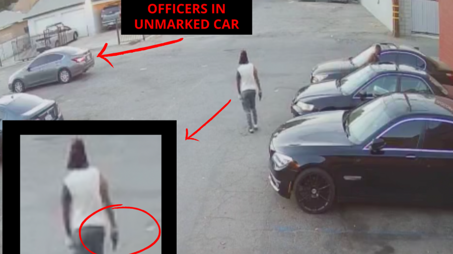 A photo shared by the San Bernardino Police Department shows the moments before a deadly police shooting on July 16, 2022, that left Robert Adams dead. (San Bernardino Police Department)