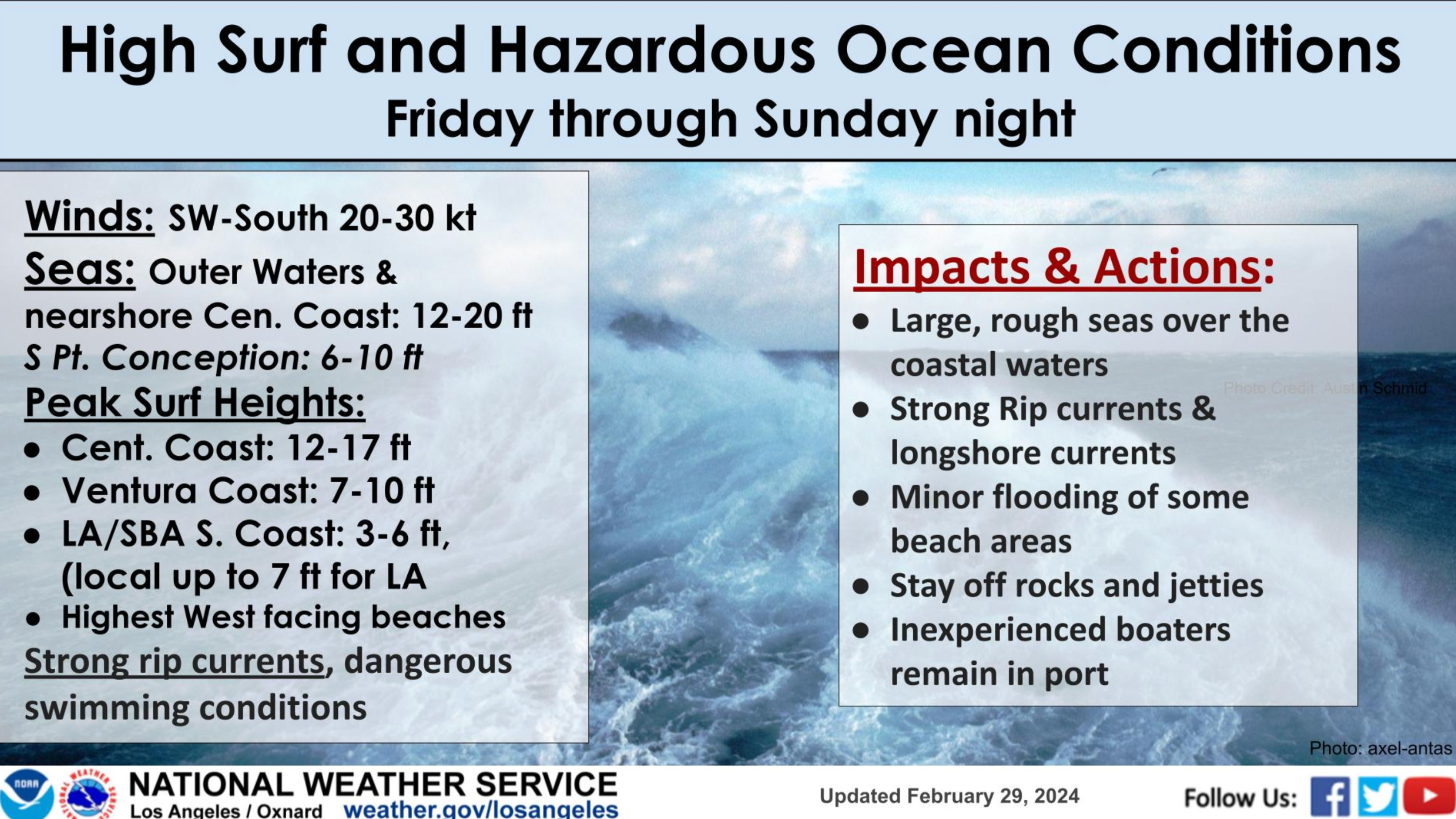 Los Angeles County can expect 3 to 6-foot surf with local sets up to 7 feet.