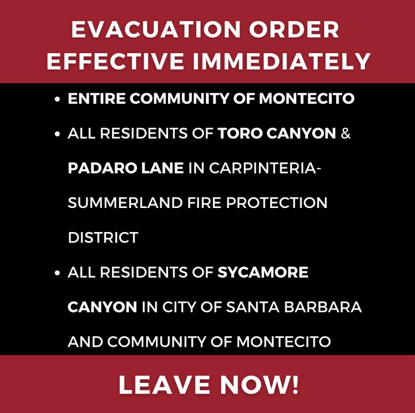 “Immediate Evacuation Order for all of Montecito, parts of Carpinteria, Summerland & City of Santa Barbara. LEAVE NOW,“ the Montecito Fire Department urgently tweeted at 12:22 p.m.