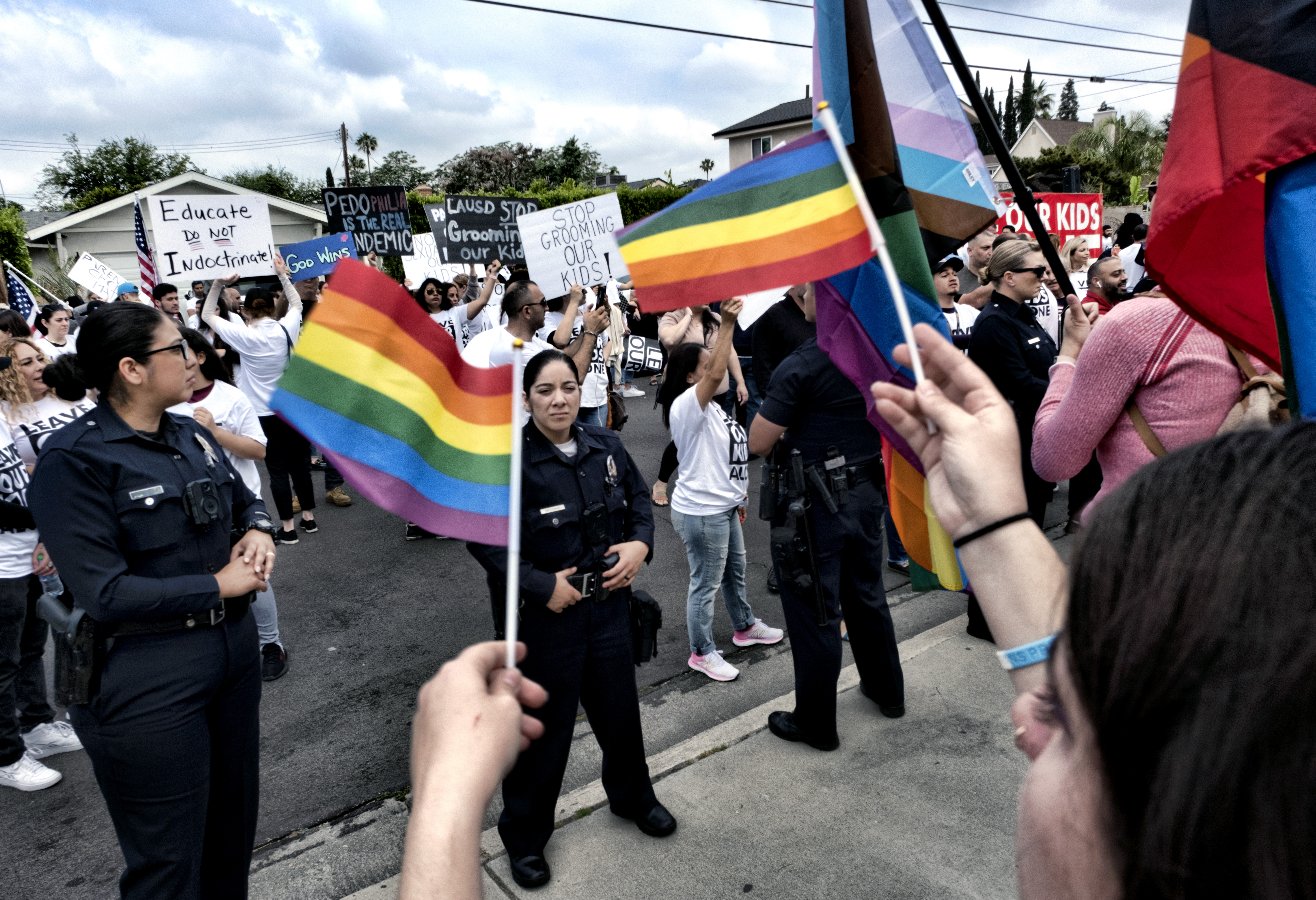 LGBTQ counter-protesters wave Pride Flags as Los Angeles police officers separate them from protesters at the Saticoy Elementary School in the North Hollywood section of Los Angeles on Friday, June 2, 2023. (AP Photo/Richard Vogel)