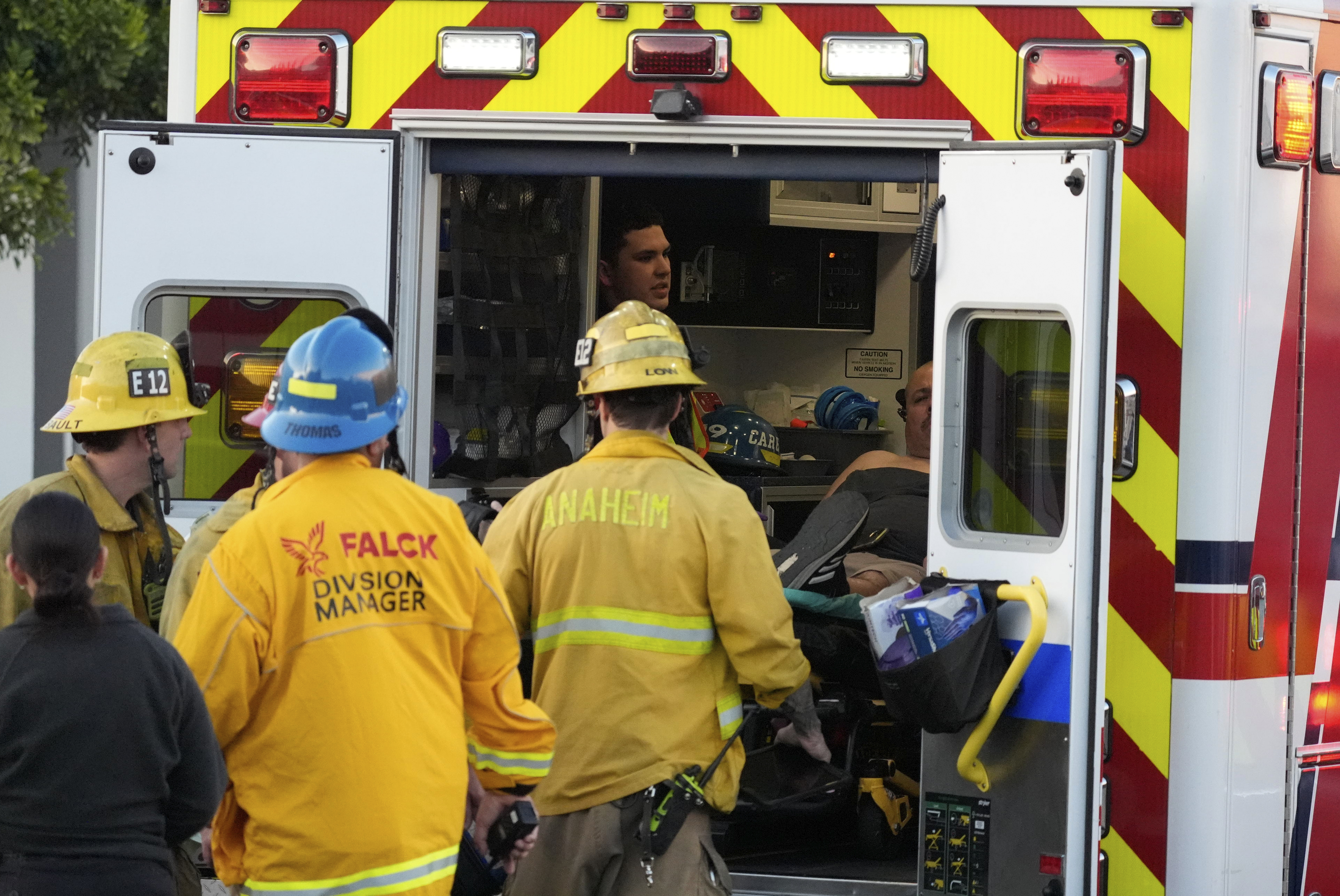 Firefighters load a person onto an ambulance after a small plane crashed into a commercial building on Jan. 2, 2025, in Fullerton, Calif. (AP Photo/Damian Dovarganes)