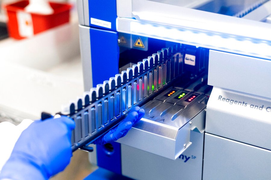 A lab scientist at the Stanford Clinical Virology Laboratory processes upper respiratory samples in Feb. 3, 2021. A new study from researchers at Stanford and UCSF now suggests that a nasal spray could, one day, prevent infection from respiratory diseases such as COVID. (AP Photo/Noah Berger)