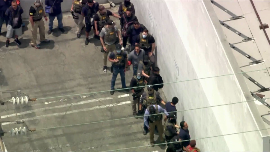 Video from above showed approximately two dozen people being loaded into unmarked white SUVs and taken away from the scene.
