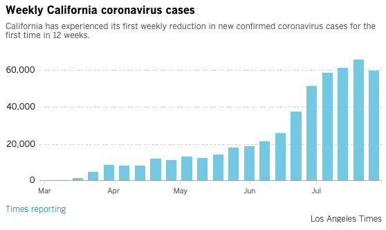 A Los Angeles Times analysis found that California has now experienced its first weekly reduction in new confirmed coronavirus cases for the first time in 12 weeks. For the seven-day period that ended Sunday, California reported 59,697 new coronavirus cases, a drop of 9% from the previous week of 65,634 cases, which was a pandemic record.