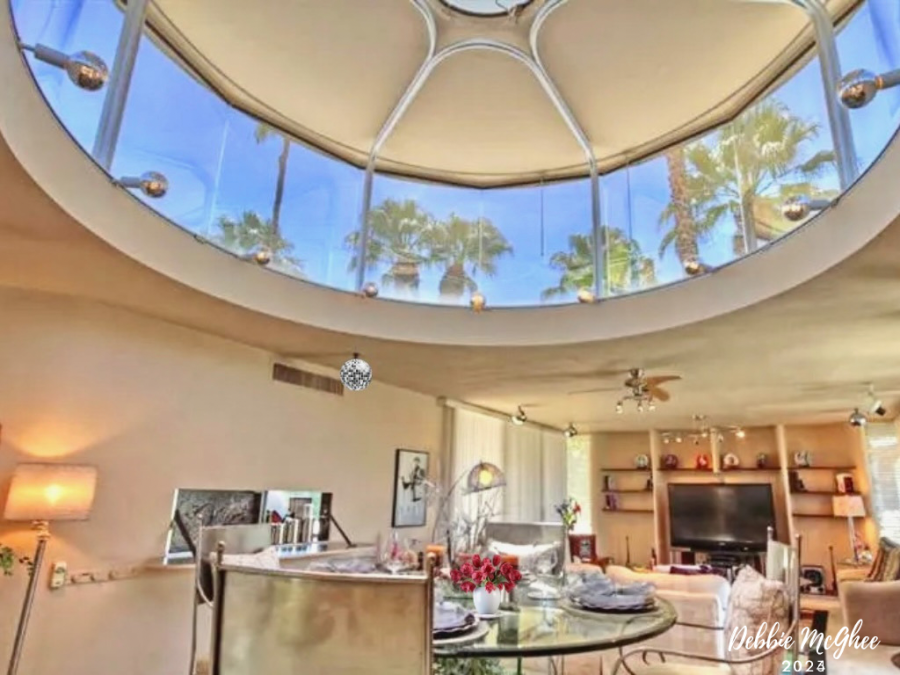 According to the listing, the dining room table sits on a circular platform which is actually a mechanical lift that propels guests several feet up and into an open air “glass turret” that offers unencumbered 360-degree views of the Coachella Valley.