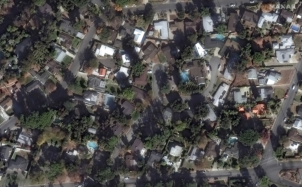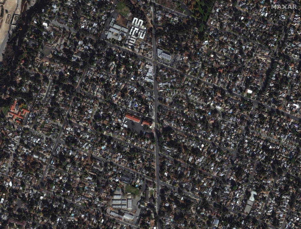 These satellite images provided by Maxar Technologies show buildings near Marathon Road before and after the Eaton Fire, Wednesday, Jan. 8, 2025, in Altadena, Calif. (Maxar Technologies via AP)