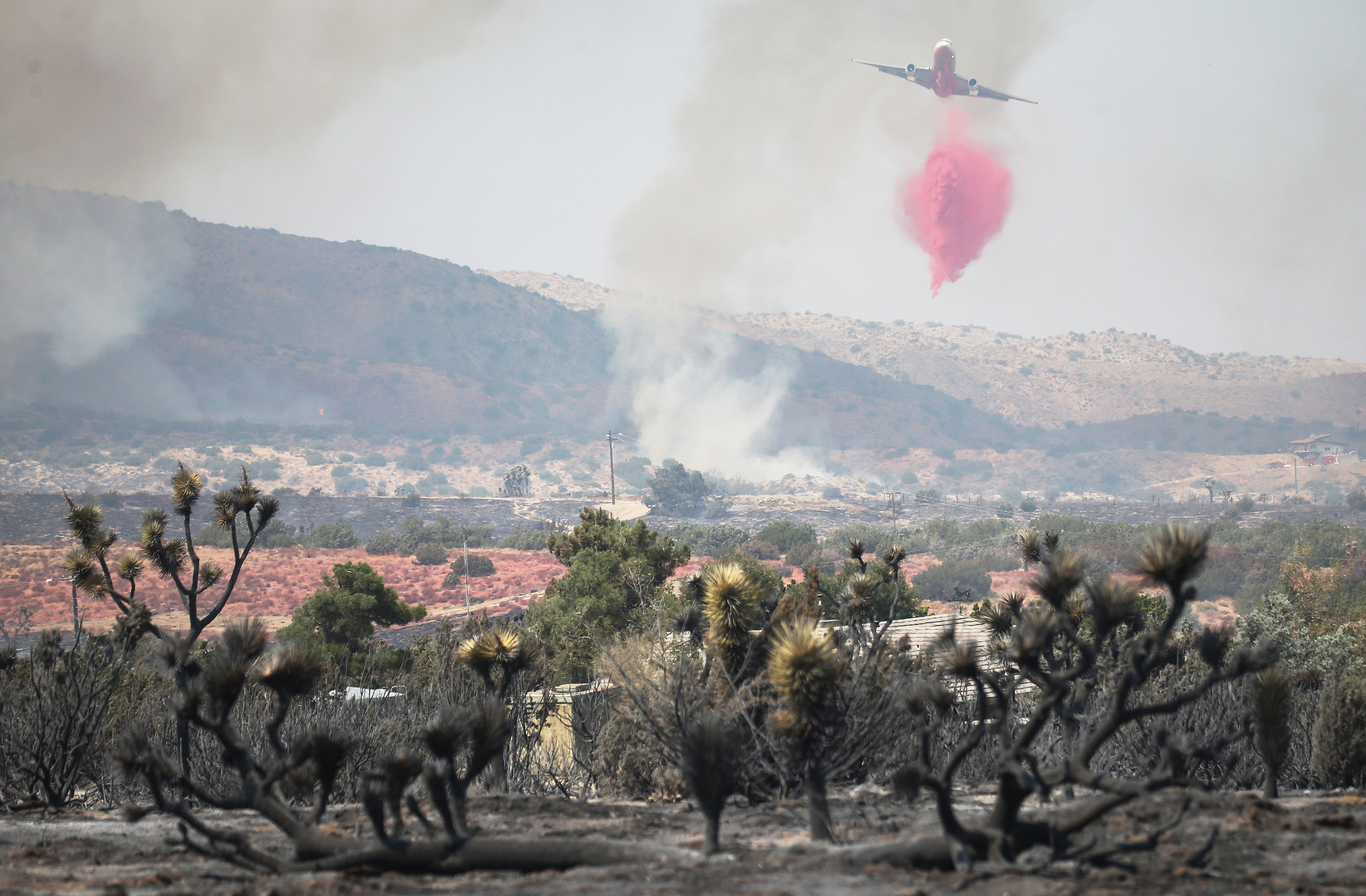 A firefighting aircraft drops the fire retardant Phos-Chek as the Bobcat Fire continues to burn on Sept. 19, 2020 in Juniper Hills, California. (Mario Tama/Getty Images)