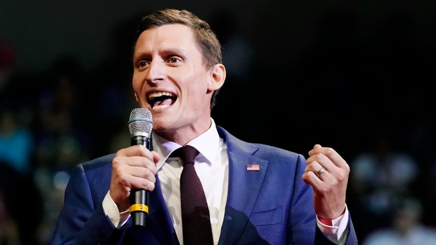 Blake Masters, a Republican candidate running for US Senate in Arizona, speaks at a rally on Friday, July 22, 2022, in Prescott, Arizona. Masters continues to struggle in his bid against Sen. Mark Kelly (D-Ariz.), polling shows. (AP Photo/Ross D. Franklin)