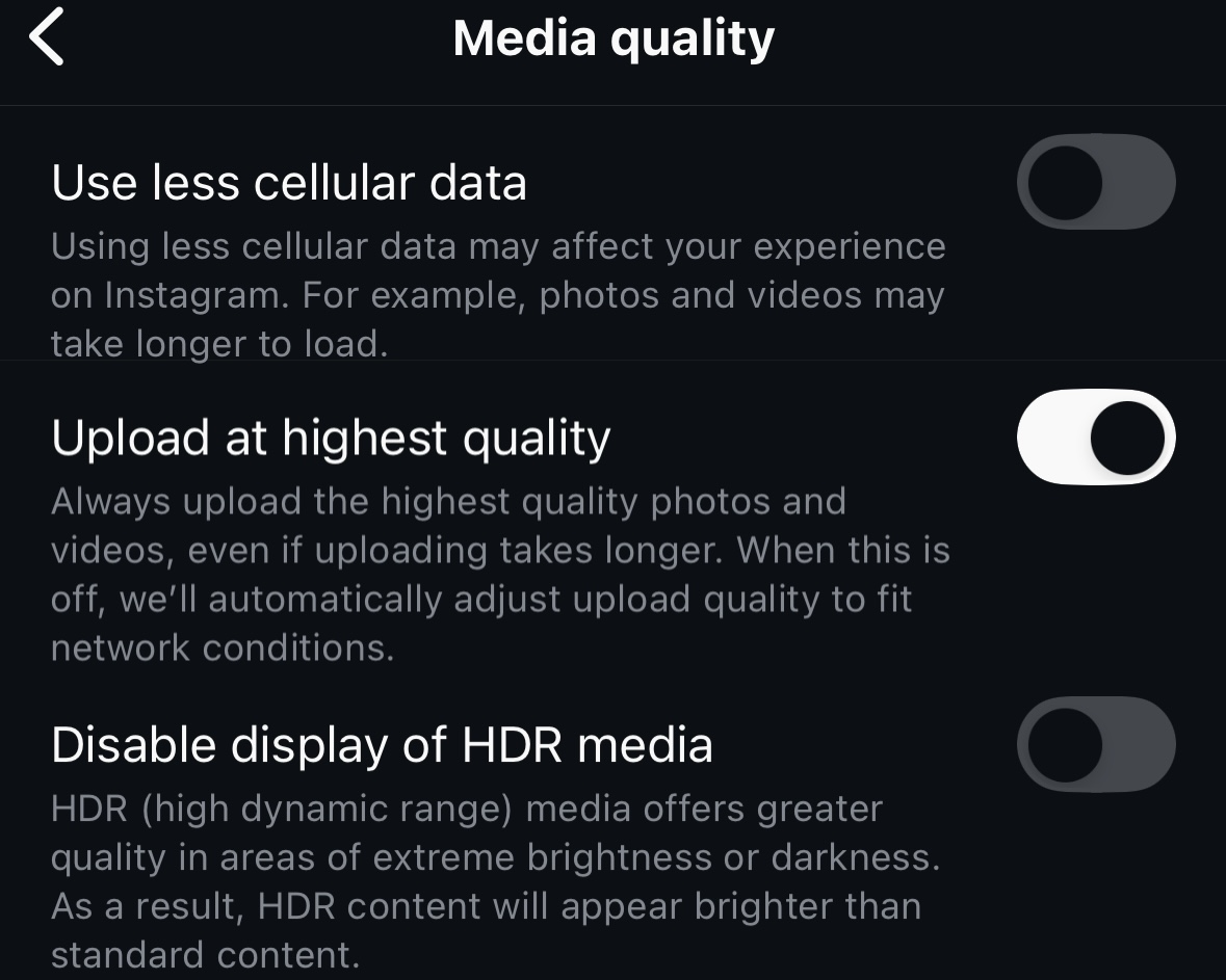 Instagram has an option that allows users to upload higher-quality media that can be found in the app settings. To turn it on, go to Settings & Privacy > Data usage and media quality > Media upload quality, and toggle on “Upload at highest quality.” This reduces compression when uploading photos and videos, especially over Wi-Fi.