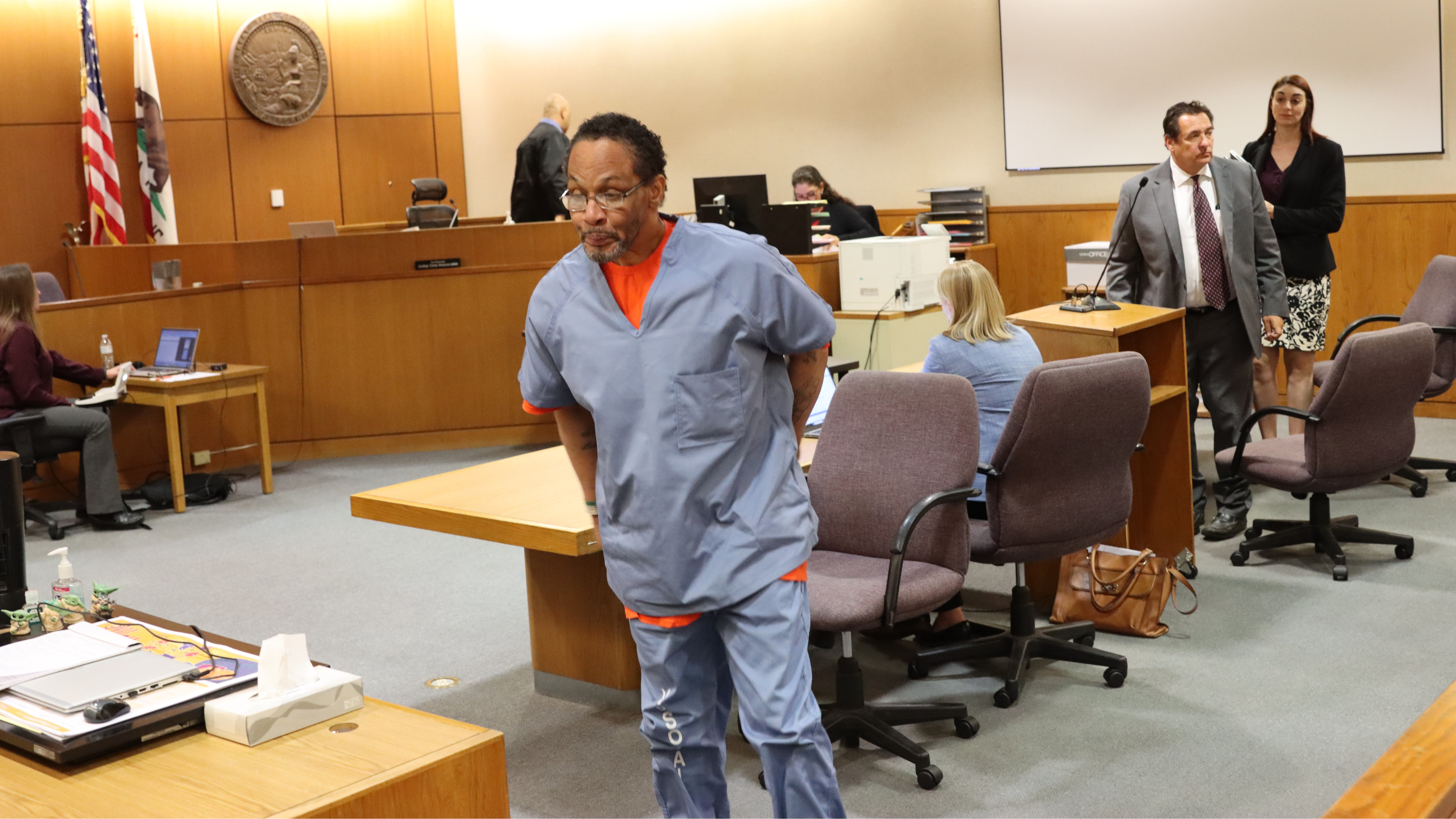 Kevin Ray James, 57, is seen here around the time he pleaded guilty to the 1997 cold case killing of bank teller Monica Leech. May 2025. (Ventura County DA’s Office)