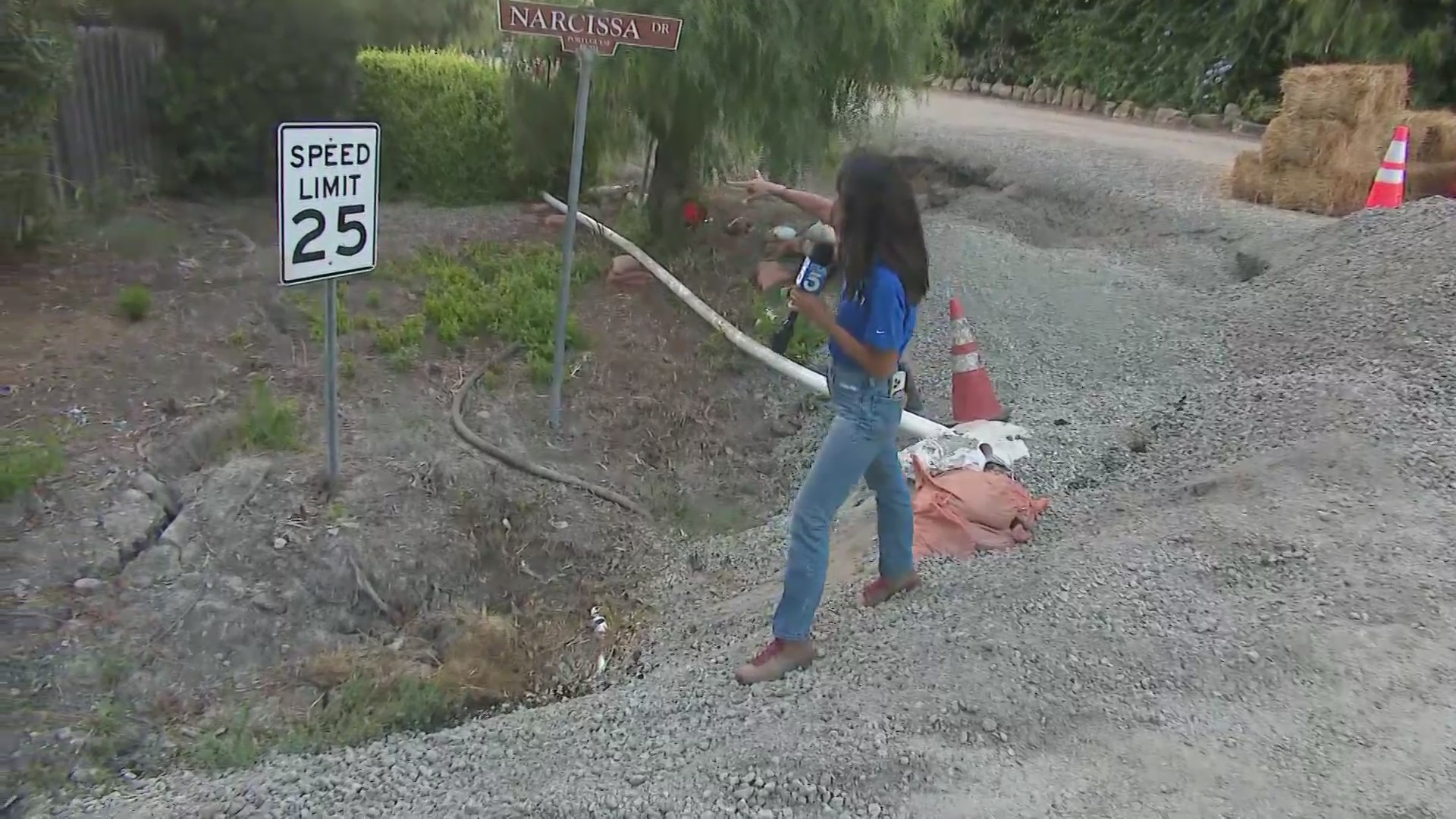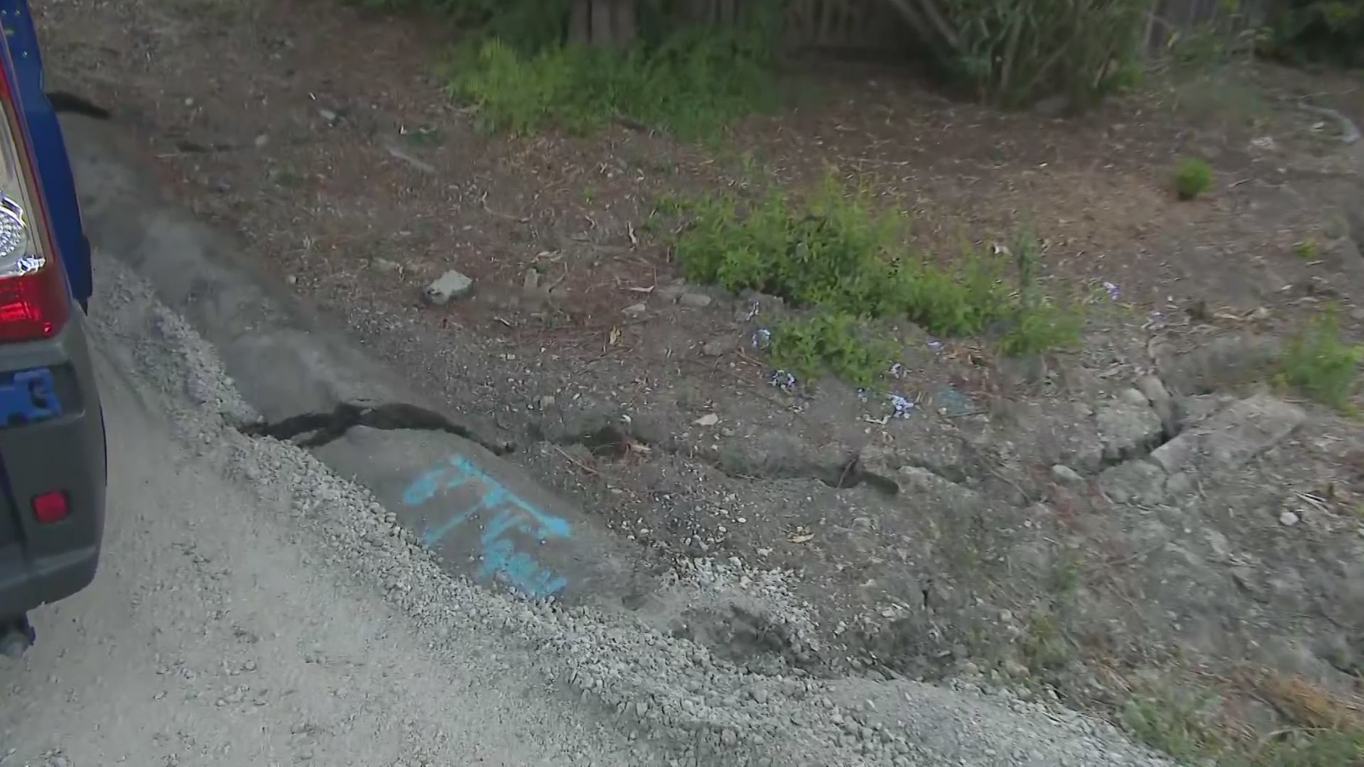 KTLA 5’s Annie Rose Ramos pointed out a large crack in the road on Narcissa Drive on Monday, where two signs had also completely shifted off the now-decayed roadway.
