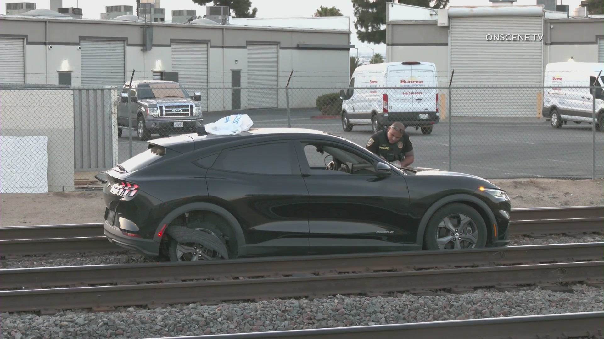 Video obtained by KTLA shows the disabled SUV sitting on the tracks with damage to one of its rear tires.
