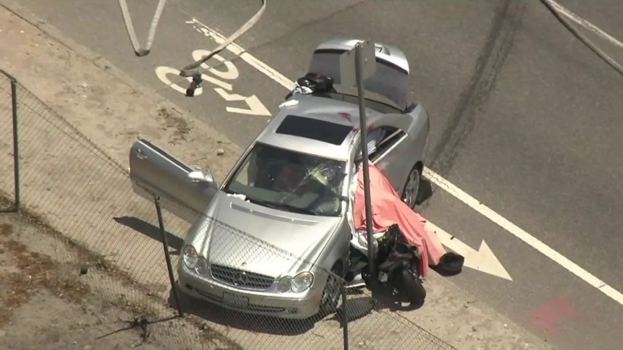 Footage from the scene showed a motorcycle covered with a red sheet slumped against the driver’s side door of the silver sedan, which had come to rest off the right shoulder.