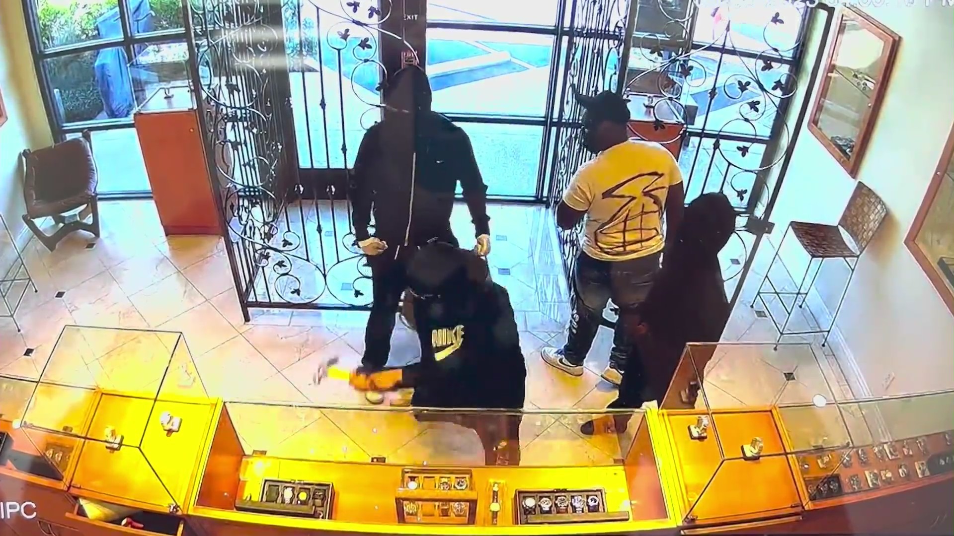 Surveillance footage shows three masked suspects in black clothing rush into the jewelry store as man inside the store, who was wearing a yellow shirt, appeared to be holding the security gate open. One of the thieves uses a hammer to shatter the glass display cases while the other two suspects begin snatching trays of watches and putting them in bags.