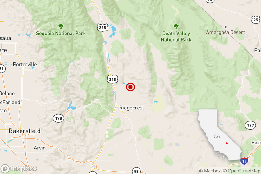 The earthquake occurred 41 miles from California City, Calif., 64 miles from Tehachapi, Calif., 68 miles from Bakersfield and 71 miles from Rosamond, Calif.