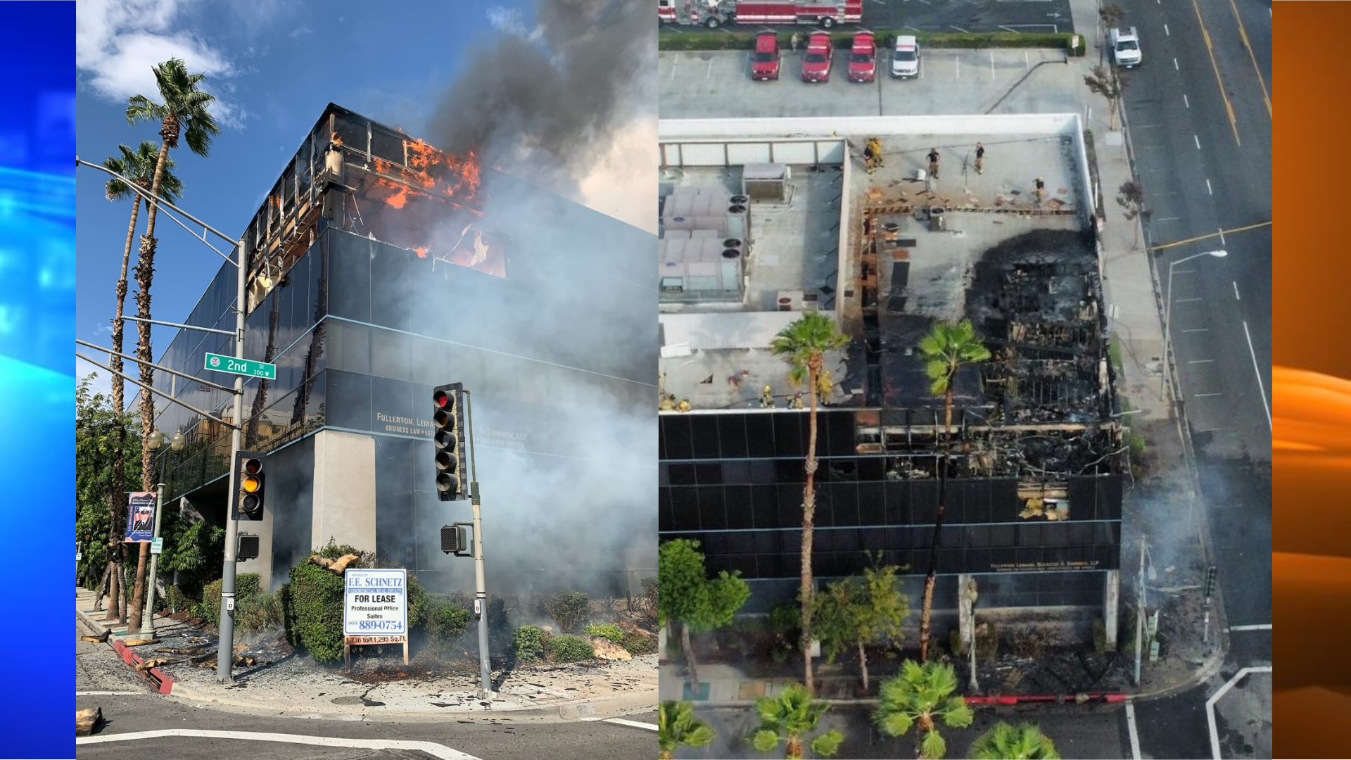 A three-alarm fire engulfed and destroyed parts of a San Bernardino office building on Saturday.