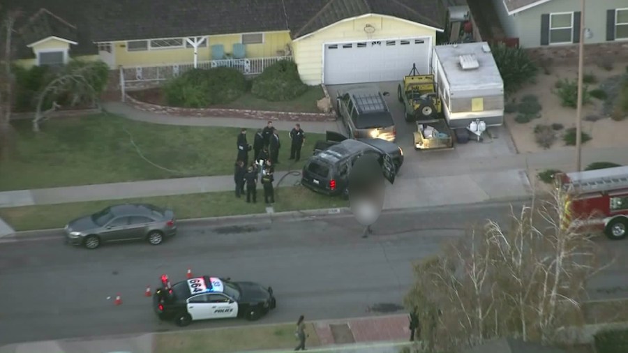 Aerial video from Sky5 showed a black GMC SUV stopped partly on the lawn and driveway of a home. All the doors were open and the charred vehicle’s windows were smashed.