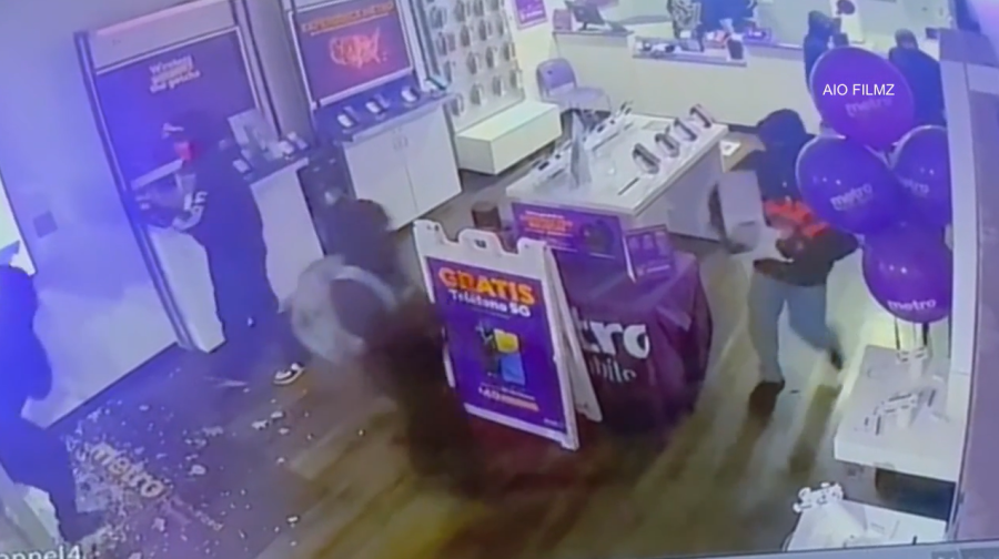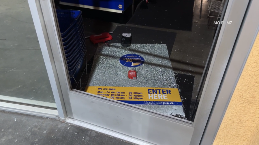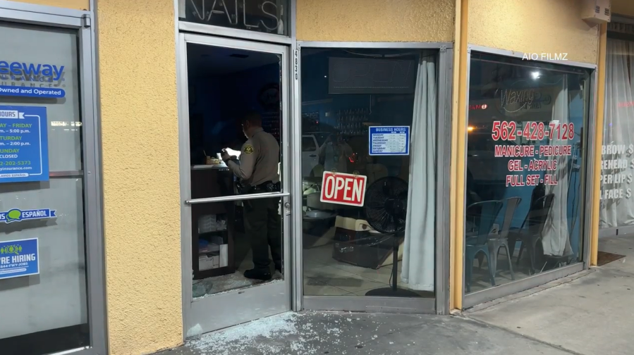 Video obtained by KTLA shows skid marks in the intersection and evidence of burglaries at three locations: