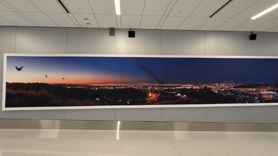 While the photo, located in the LAX Midfield Satellite Concourse, is pretty beautiful – it depicts a twilight view of most of the city, including most of L.A., parts of the hills above the urban sprawl and even some birds – it doesn’t take long for people viewing it to notice a large plume of black smoke rising into the sky, right in the middle of the shot.