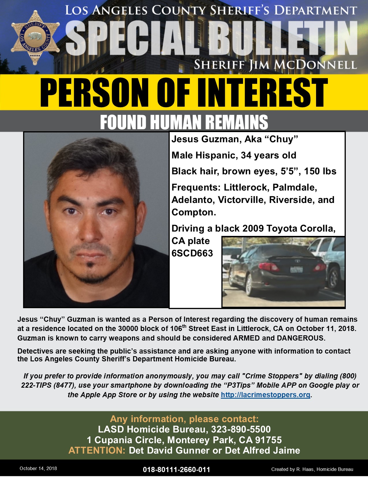 Anyone with information can contact the Homicide Bureau at their 24-hour number, 323-890-5500. Anonymous tips may be submitted via Crime Stoppers at 800-222-8477 or LACrimeStoppers.org.