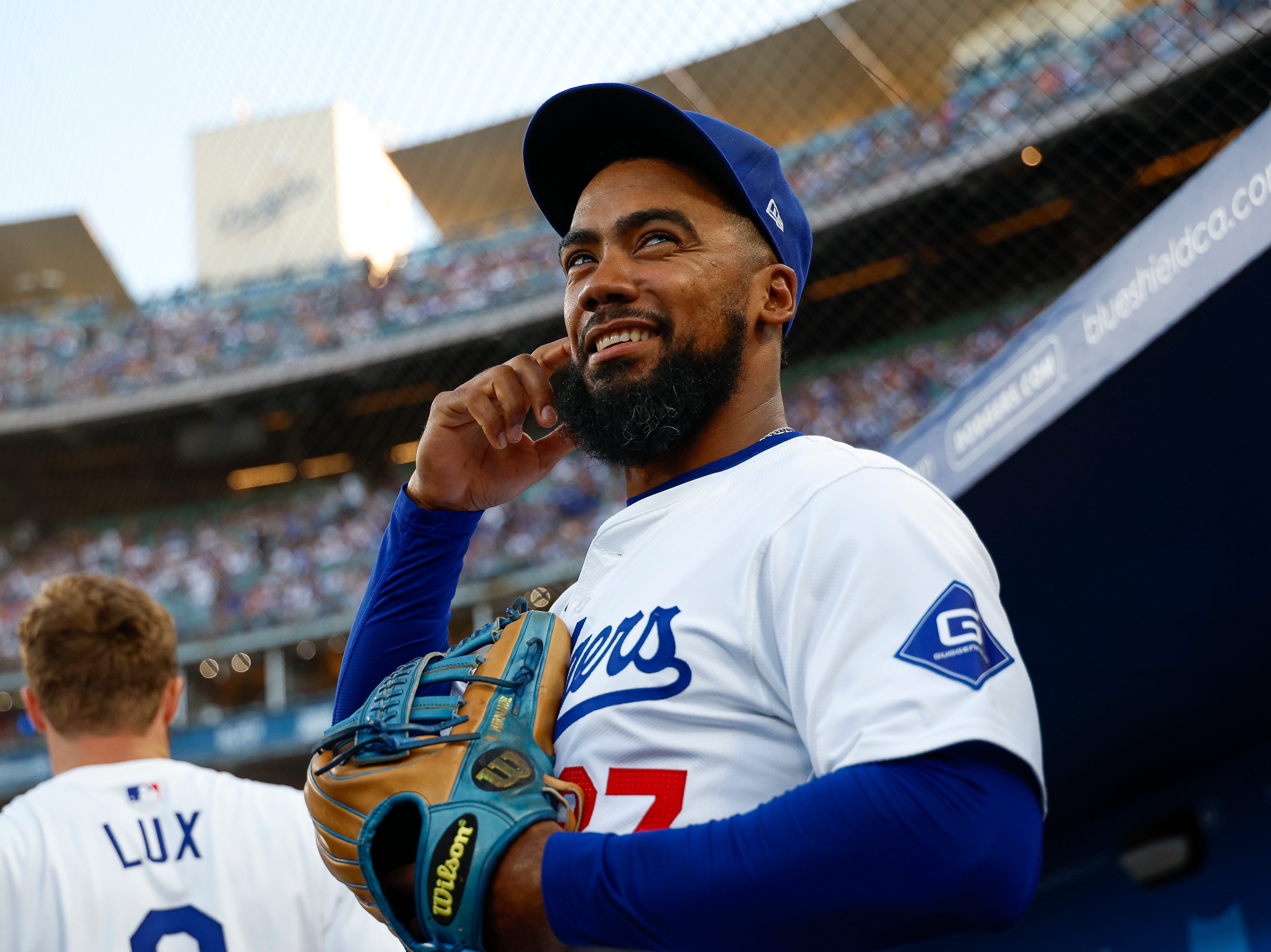 Teoscar Hernandez #37 of the Los Angeles Dodgers in the dugout prior to a game against the Philadelphia Phillies at Dodger Stadium on Aug. 7, 2024, in Los Angeles, California. (Getty Images)