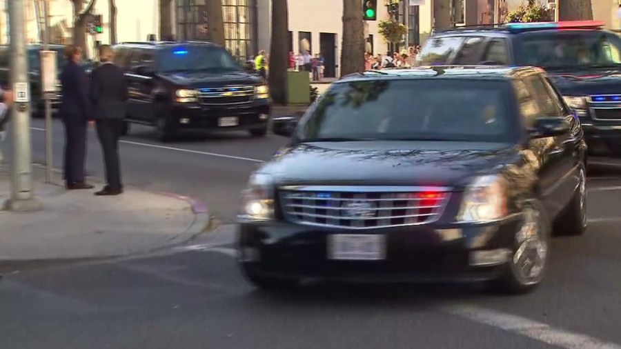 Vice President Joe Biden's motorcade arrives at a fundraiser in Los Angeles on Oct. 6, 2014. (Credit: KTLA)