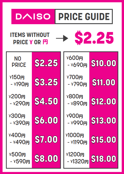 Items without a price start at $2.25, according to the price guide shared by Daiso. Those marked between ¥150円 and ¥190円 are $3.25. You can see the aforementioned price guide below, courtesy of Daiso: