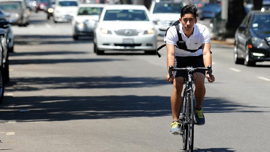 A cyclist rides along Westwood Boulevard in Westwood. (Credit: Wally Skalij / Los Angeles Times)