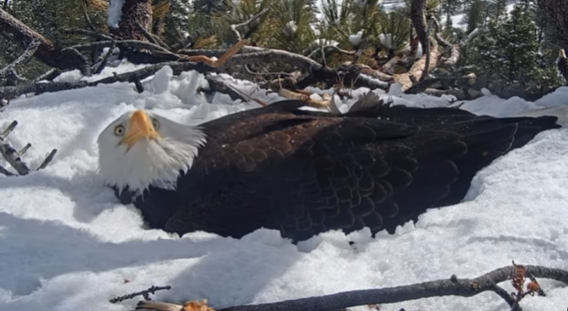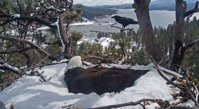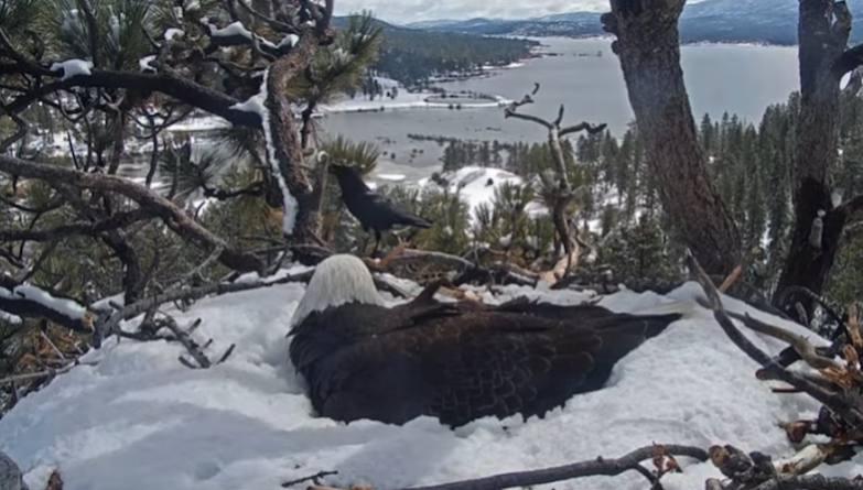 Despite no offspring this time around, the eagles still defend their nest with valor, as evidenced by Jackie giving a nosy raven the death stare on Saturday, preventing it from getting to the unviable eggs.